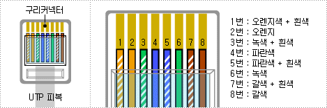 | 위 그림은 TIA/EIA-568B 표준에 의한 UTP Cable의 모듈형 8짹핀의 페어 배치입니다. | |